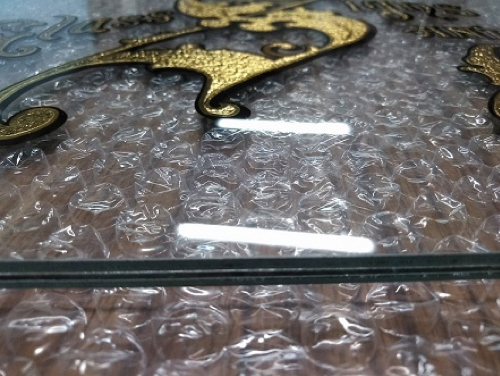 4)後は合わせ加工ですが、以前※サンドブラスト加工したガラスを合わせた際に、ガラスが割れてしまった事がありました。その時は、何枚もの試作を繰り返し、割れや、気泡が入る失敗を繰り返しましたが、エッチング加工の彫る深さが重要で、深く彫れば、立体感が出てロゴや文字を浮き出す事ができるのですが、合わせ加工時の加圧に耐える事ができずに、割れや、気泡が入る原因になってしまったのです。